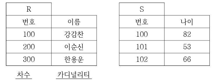 다음 릴레이션(relation) R과 S의 카티션 프로덕트(cartesian product) 연산 시 결과 릴레이션의 차수(degree)와 카디널리티(cardinality) 값은?