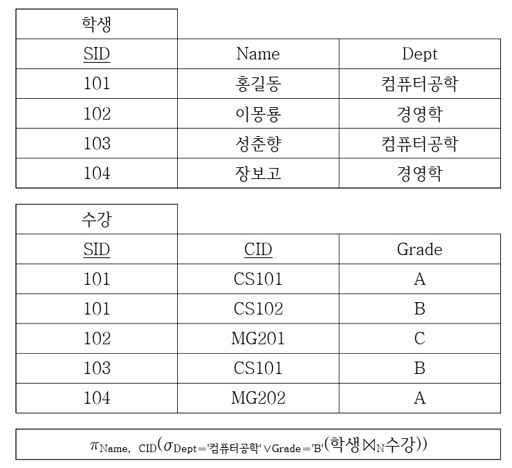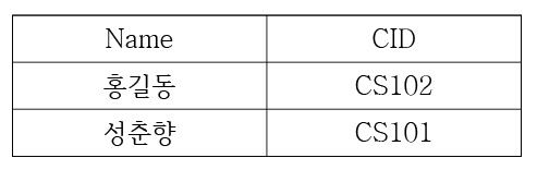 다음 두 릴레이션 학생과 수강에서 아래 관계대수에 의해 생성된 결과로 옳은 것은? (단, 수강 릴레이션의 SID는 학생 릴레이션의 SID를 참조하는 외래키(foreign key)이다)