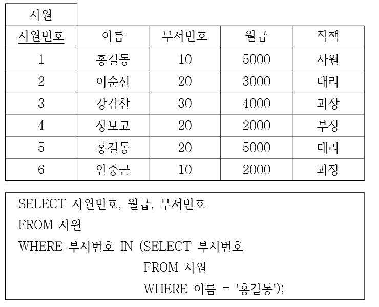 다음 릴레이션에서 아래 SQL문을 실행하면 나오는 투플의 개수는?