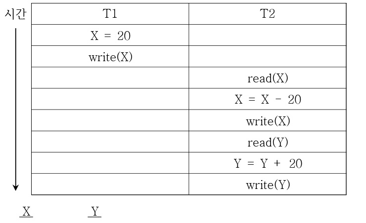 다음 트랜잭션 T1과 T2를 수행한 후 X와 Y의 최종값은? (단, X와 Y의 초깃값은 각각 100, 200이다)
