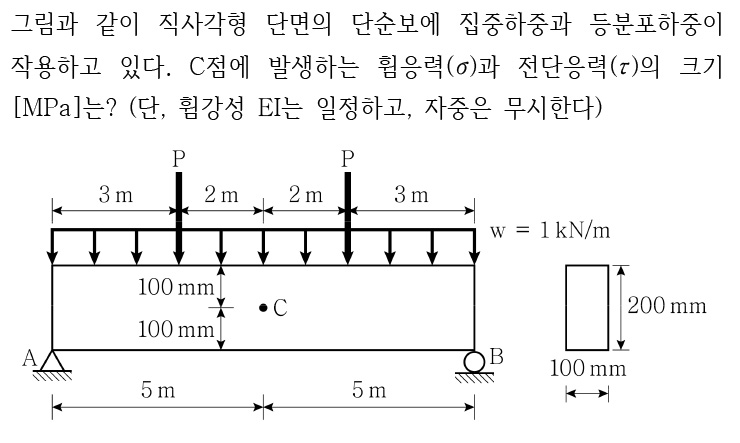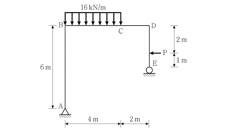 그림과 같이 하중을 받는 라멘구조에서 C점의 휨모멘트가 0이 되기 위한 집중하중 P[kN]는? (단, 휨강성 EI는 일정하고, 자중은 무시한다)