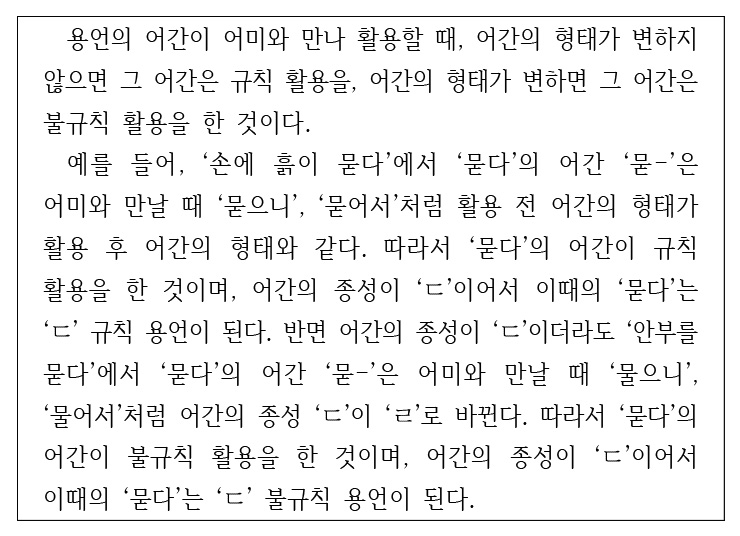 ‘문을 닫다’에서 ‘닫다’는 ‘ㄷ’ 불규칙 용언이다.