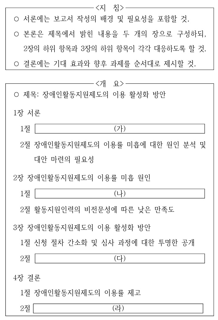 <지침>에 따라 <개요>를 작성할 때 (가)~(라)에 들어갈 내용으로 적절하지 않은 것은?
