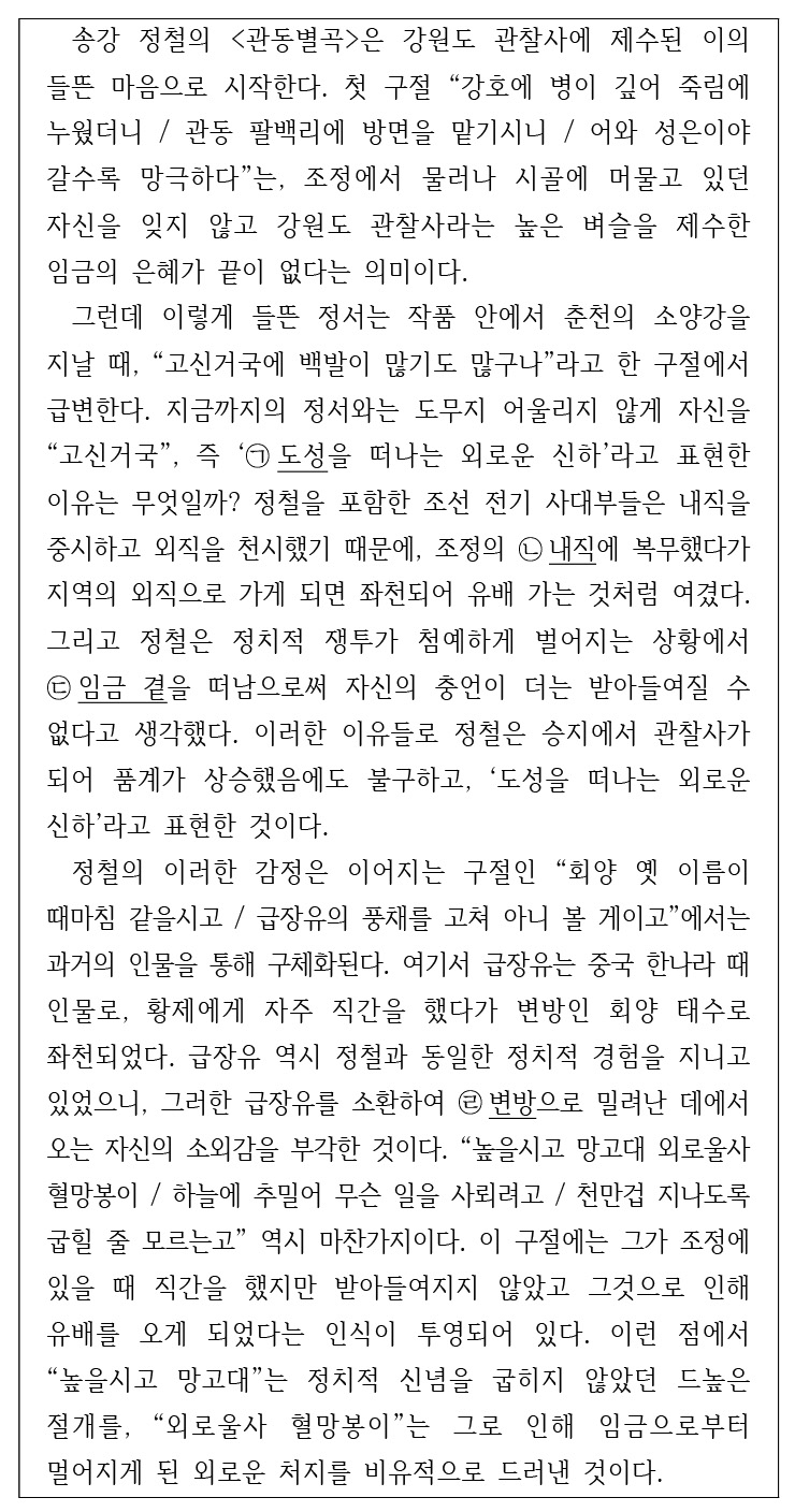 “고신거국”은 강원도 관찰사로 가게 된 것을 좌천되어 유배 갔다고 여기는 정철의 마음을 담고 있는 표현이다.
