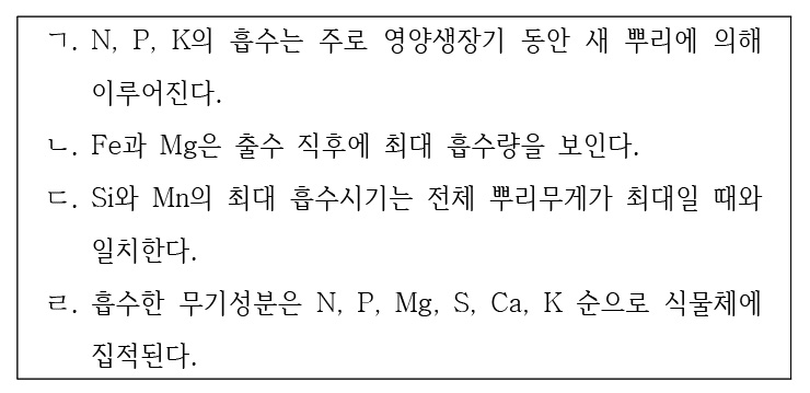 벼의 생육과 무기양분의 흡수에 대한 설명으로 옳은 것만을 모두 고르면?