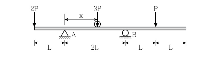 그림과 같은 내민보에서 지점 B의 상향 수직반력이 4P가 될 때, 거리 x는? (단, 보의 자중은 무시한다)