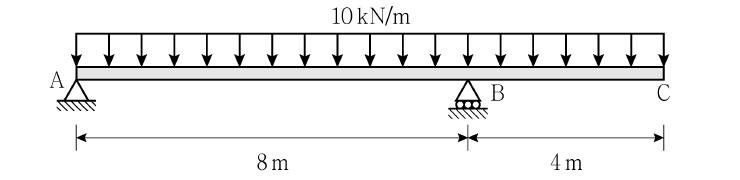 그림과 같이 내민보에 등분포하중 10kN/m가 작용할 때, A 지점의 수직반력[kN]은? (단, 보의 자중은 무시한다)