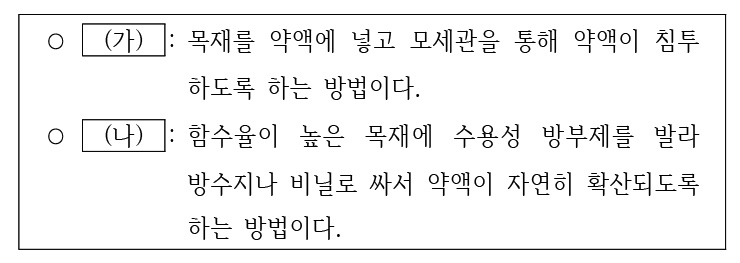 다음은 목재방부처리 방법에 대한 설명이다. (가)와 (나)에 들어갈 말을 바르게 연결한 것은?