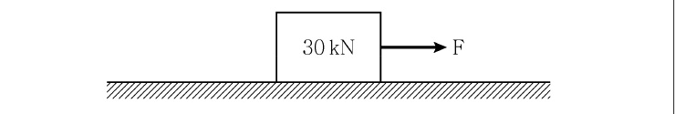 그림과 같이 무게 30kN의 직사각형 블록에 수평방향으로 하중이 작용할 때, 블록이 미끄러짐이 발생하기 직전의 최대 수평방향 힘(F)의 크기[kN]는? (단, 블록과 수평면 사이의 정지마찰계수는 0.5이다)