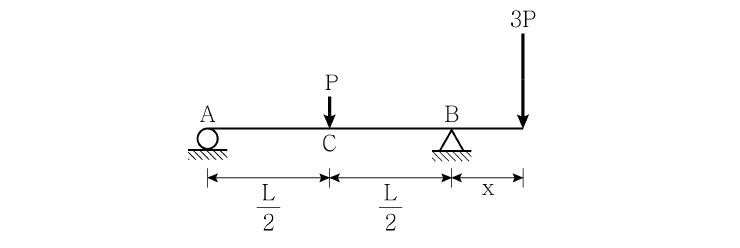 그림과 같은 내민보에서 C점의 휨모멘트가 0이 되는 길이 x는? (단, 자중은 무시한다)